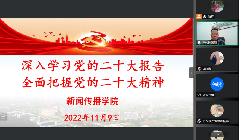为扎实推动学习宣传贯彻党的二十大精神走进师生,2022年11月9日,新闻传播学院党委组织开展以“深入学习党的二十大报告、全面把握党的二十大精神”为主题的专题学习辅导活动。参加线上活动的有学院全体教工,全体学生党员,以及学生入党积极分子代表等近240人。