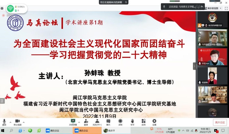11月9日,“马真论坛”邀请北京大学马克思主义学院党委书记、博士生导师孙蚌珠教授开展第1期学术讲座,题为“为全面建设社会主义现代化国家而团结奋斗——深入学习贯彻党的二十大精神”。讲座以腾讯会议线上的方式进行,由马克思主义学院党总支书记张庆守主持。