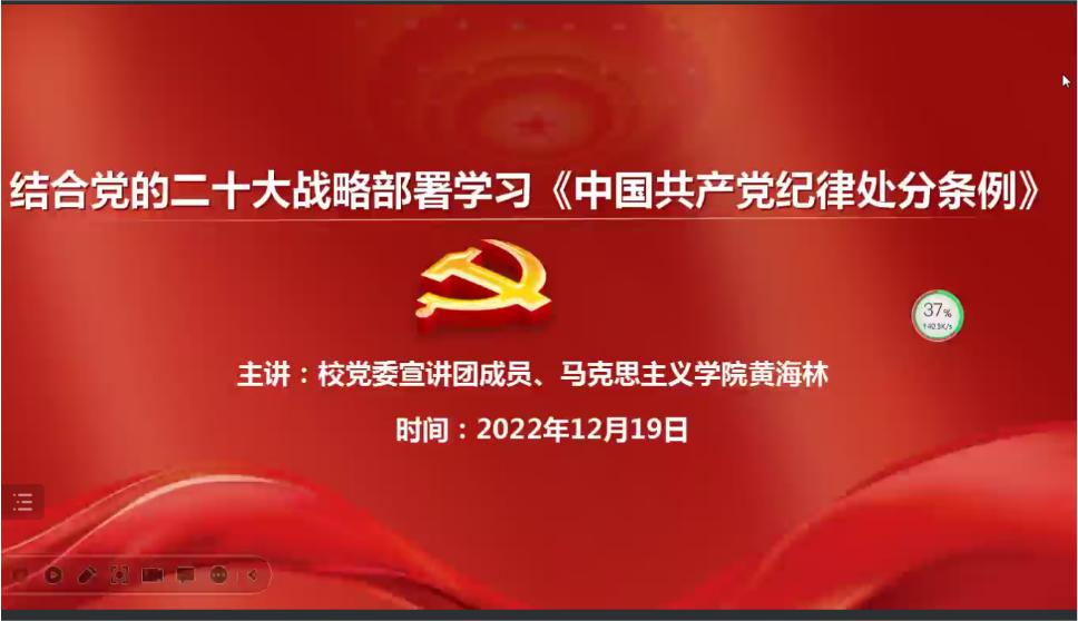 12月19日,法学院举行“学习二十大,永远跟党走”学生党员培训班线上系列专题讲座。校党委宣讲团成员、马克思主义学院形势与政策教研室主任黄海林副教授以“结合党的二十大战略部署学习《中国共产党纪律处分条例》”为主题,深入阐释了党的二十大报告要点、重点,结合报告中关于坚定不移全面从严治党的论述,解读分析了《中国共产党纪律处分条例》的亮点、热点。法学院全体学生党员参加讲座。