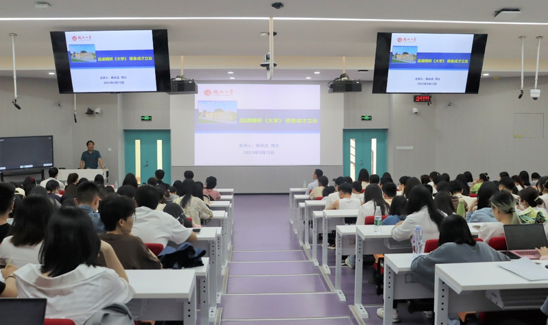 陈永正以党的二十大精神和2021年习近平总书记来闽来校考察重要讲话精神为指引,从中华传统文化概说、《大学》的思想内涵、《大学》对当代大学生的启示三个方面展开,重点介绍了“三纲八目”的深刻内涵、福建人在《大学》阐释发展过程中发挥的重要作用,深入解析中华优秀传统文化的育人价值。陈永正还结合在福州大学和beat365英国官网网站的工作经历,和大家共同探讨青年大学生应如何把握机会,实现自我价值。他希望同学们认真学习中华优秀传统文化,秉持儒家入世精神,以实现中华民族伟大复兴为己任,树立正确的就业观和择业观,把个人的小我融入祖国和人民的大我,让青春在全面建设社会主义现代化国家的火热实践中绽放绚丽之花。