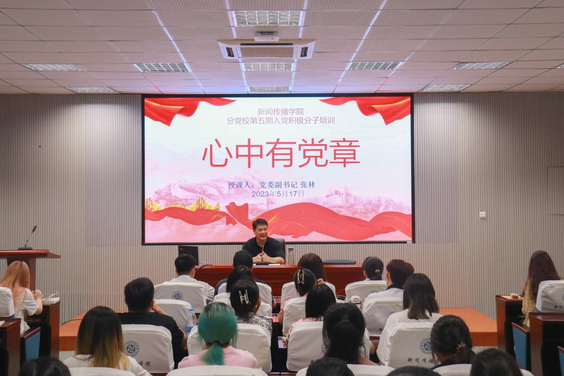 5月17日,新闻传播学院于工科楼B座学苑讲坛召开“学习贯彻习近平新时代中国特色社会主义思想”主题教育读书会,学院党委副书记张林、组织员陈海祥,第五期入党积极分子培训班80名学员参加活动。