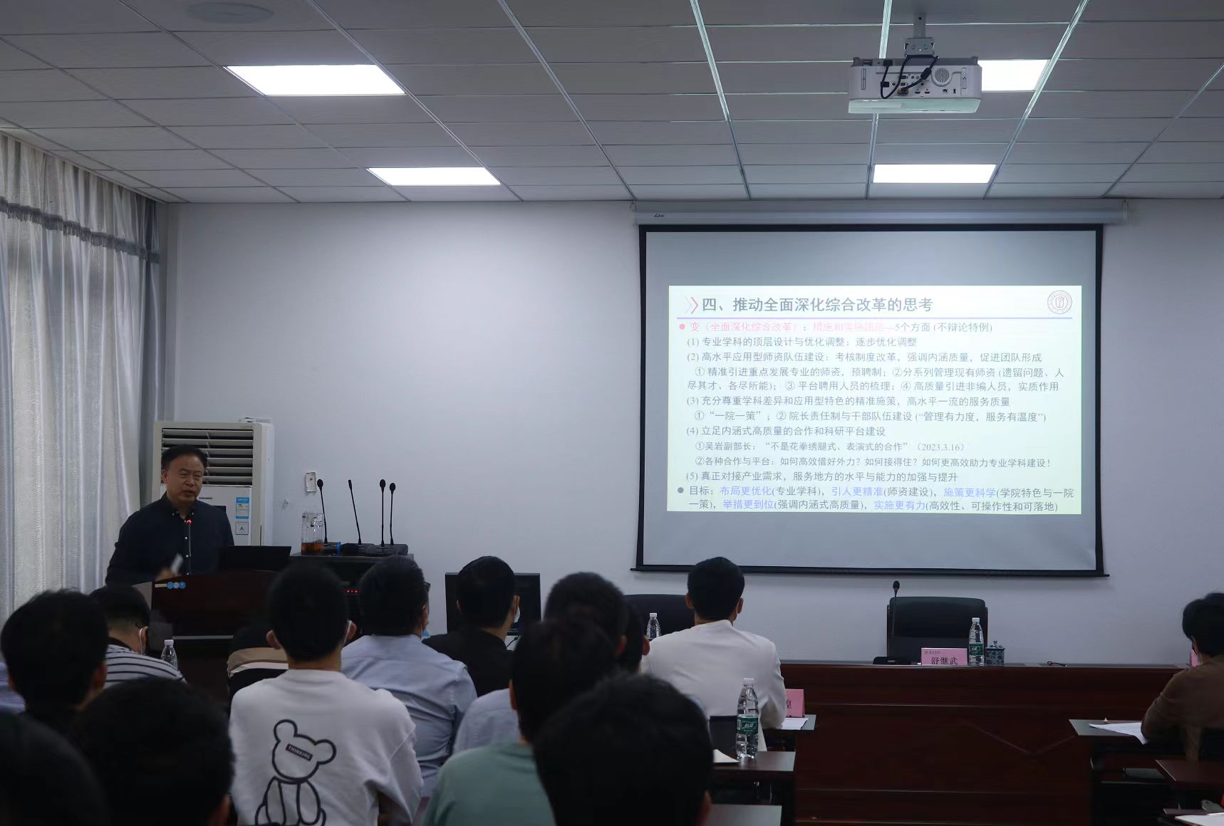 舒继武系统阐述了开展学习贯彻习近平新时代中国特色社会主义思想主题教育的目的意义、具体任务、主要目标以及党的二十大报告关于教育、科技、人才的重要论述。他指出,要把学习贯彻习近平新时代中国特色社会主义思想主题教育与学习贯彻习近平总书记来校考察重要讲话精神和对学校办学的重要指示批示精神结合起来,与推进学校高质量发展结合起来,全面把握、融会贯通、落实落细,坚定不移沿着习近平总书记指引的方向走好应用型办学之路。