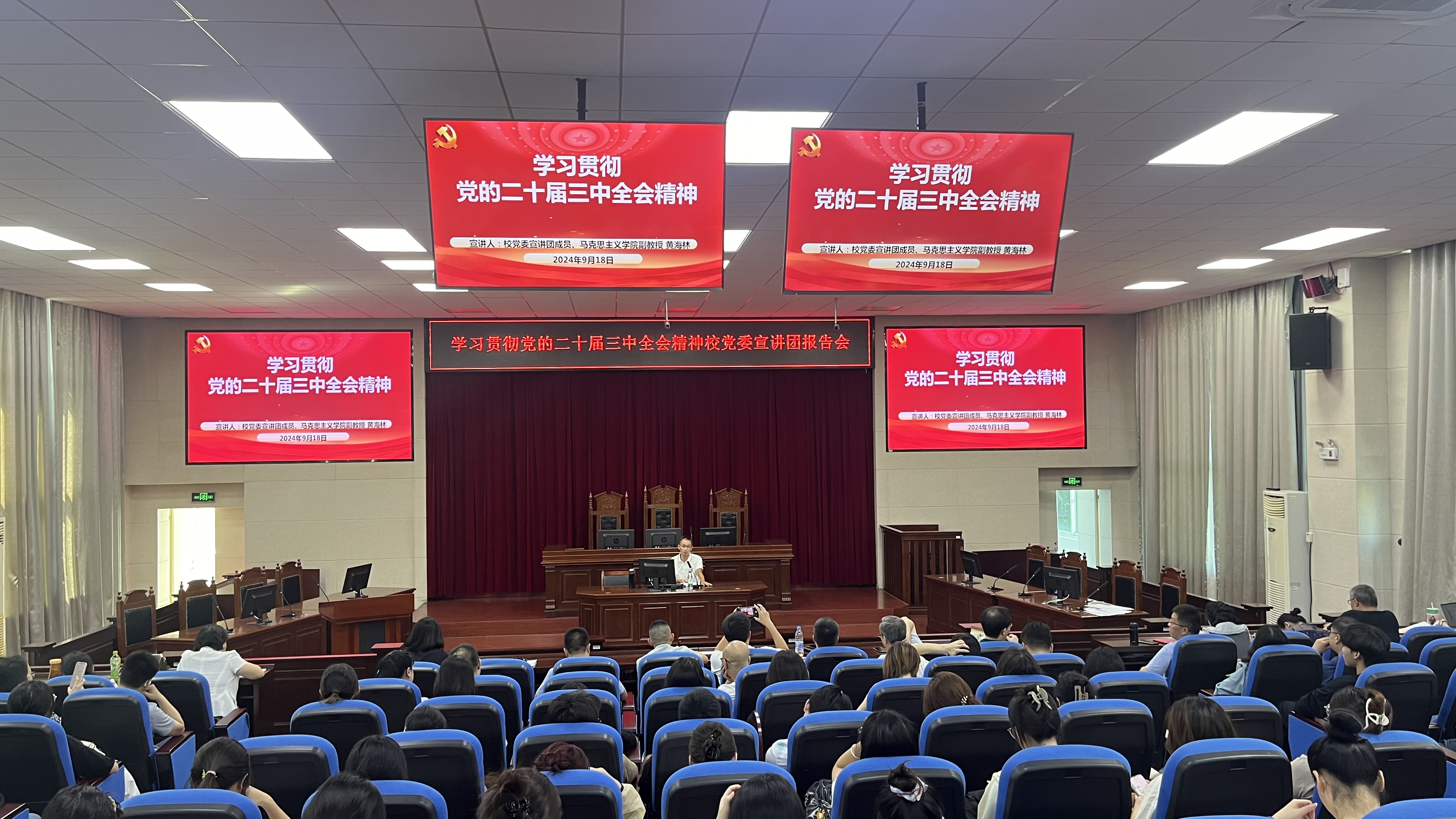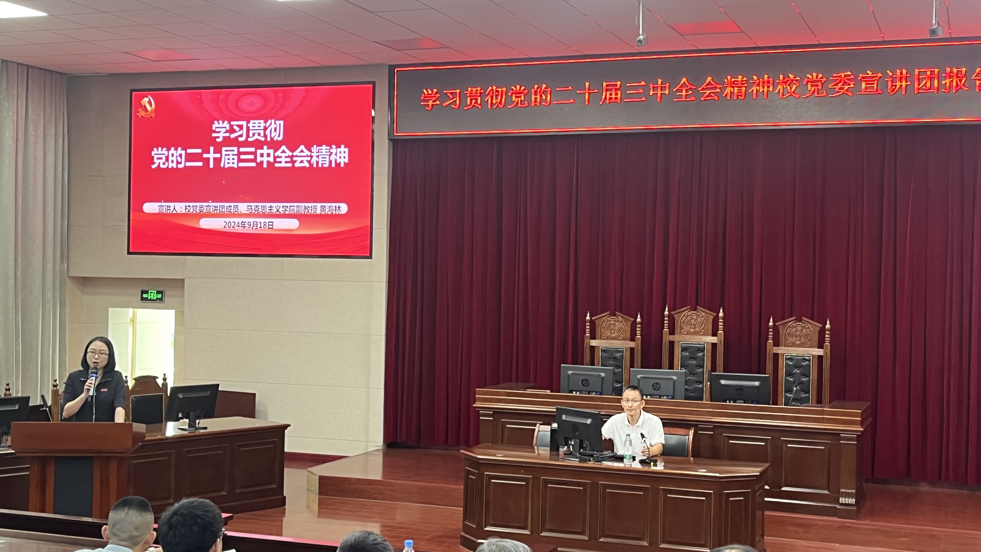 9月18日,法学院在模拟法庭召开学习贯彻党的二十届三中全会精神宣讲报告会暨宣讲动员会。会议邀请了学校宣讲团成员、马克思主义学院副教授黄海林作宣讲报告。法学院全体教师、学生党员和入党积极分子等200余人参加了报告会。会议由法学院党委书记戴少娟主持。