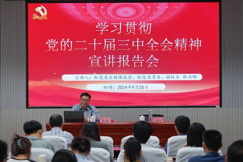 9月25日,新传学院在学苑讲坛召开党的二十届三中全会精神宣讲会。宣讲会邀请校党委宣讲团成员、校党委常委、陈兴明副校长主讲。活动由学院党委书记陈国岱主持,学院全体教职工及学生党员聆听了报告。