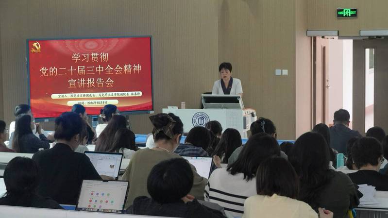 10月9日,外国语学院学习宣传贯彻党的二十届三中全会精神宣讲会在教学楼1A207举行,科研处副处长、马克思主义学院副院长林春玲副教授应邀作专题辅导报告,外国语学院全体教职工和学生党员参会。会议由外国语学院党委副书记郭崚主持。