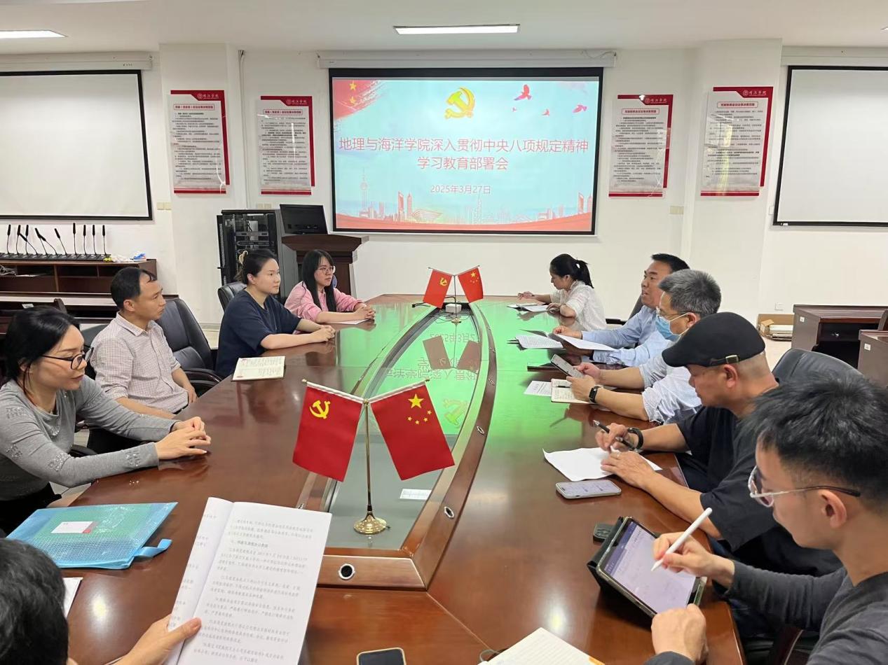 3月27日,地理与海洋学院召开深入贯彻中央八项规定精神学习教育部署会,学院领导班子、党委委员、各党支部书记等参加会议,会议由学院党委书记林庆主持。