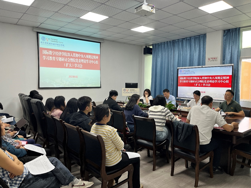 近日,国际数字经济学院召开党委理论学习中心组(扩大)学习会议,专题学习《党的十八大以来深入贯彻中央八项规定精神的成效和经验》和《八项规定改变中国》。会议由学院党委书记黄晓明主持。学院党委理论学习中心组成员、行政人员、辅导员和专任教师代表参加会议。