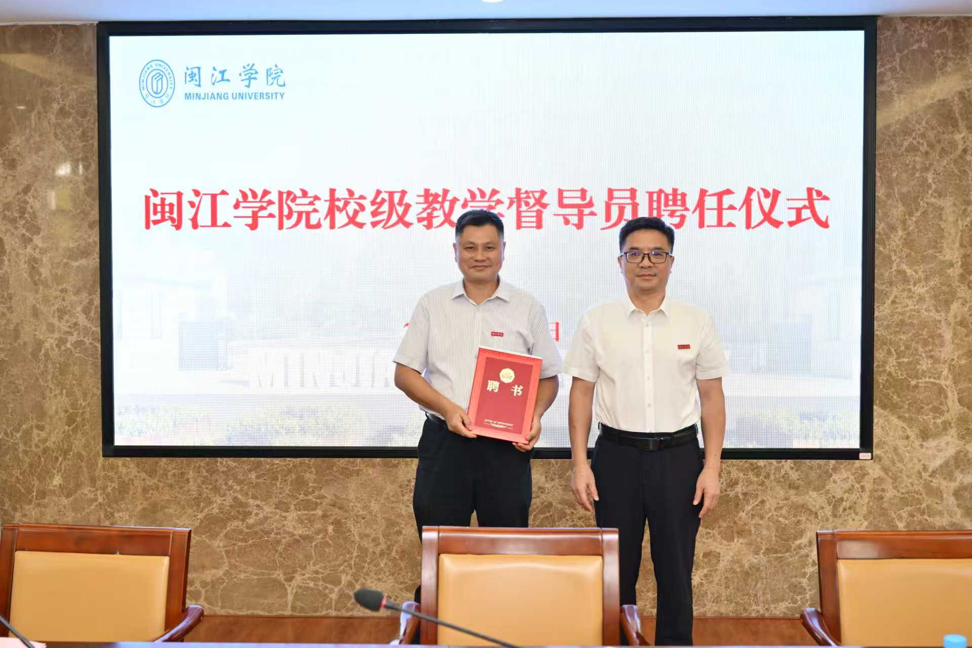 陈兴明为第五批正处级教学督导员杨美英工作室授牌,并为新聘校级教学督导员张庆守教授颁发聘书。仪式简朴而隆重,体现了学校对教学督导工作的高度重视。