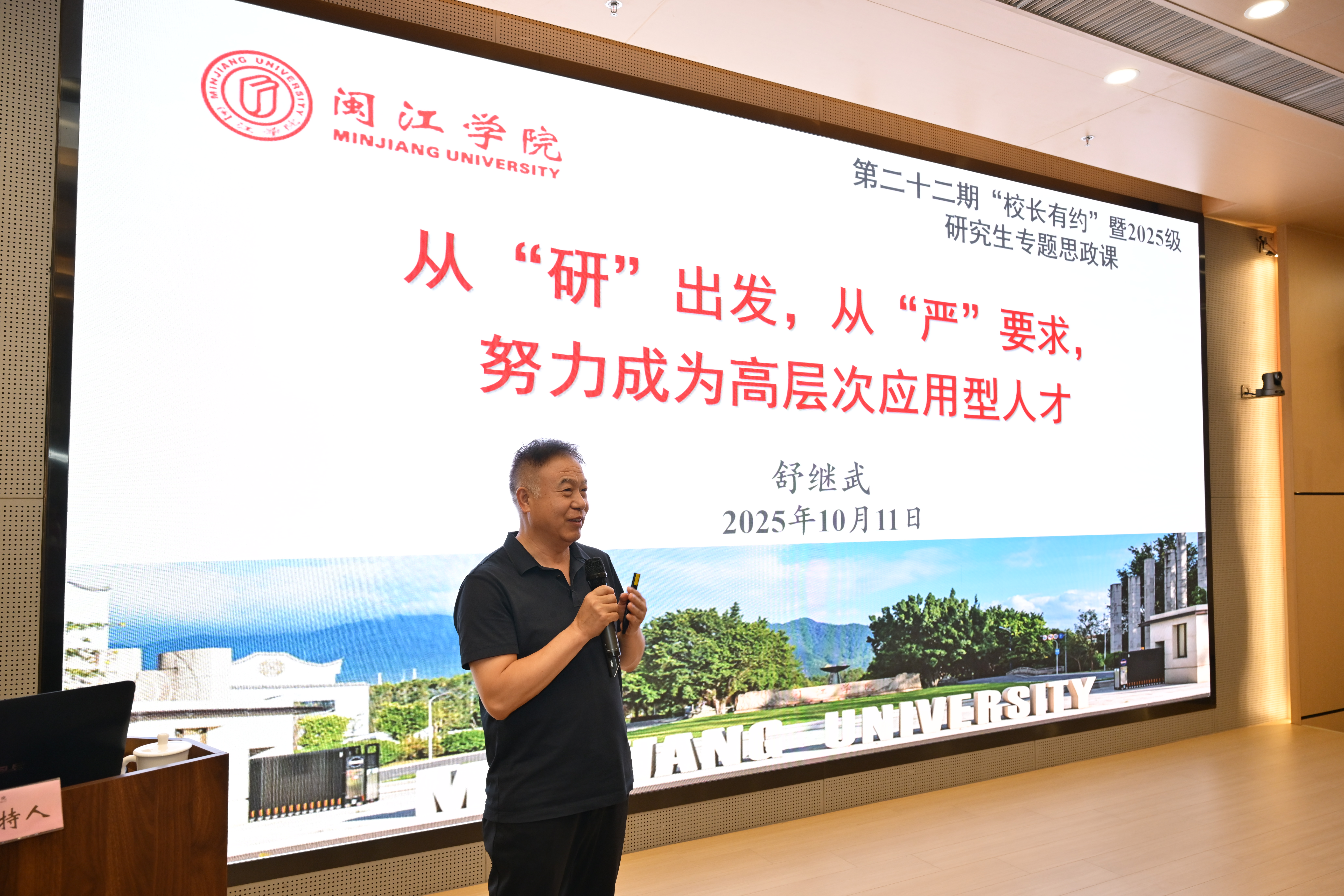 10月11日,beat365举办“校长有约”研究生专题思政课。校长舒继武以《从出发,从“”要求,努力成为高层次应用型人才》为主题,为2025级全日制研究生讲授了一堂内涵丰富、思想深刻的专题思政课。学工部、团委、教务处、科研处、研究生处、后勤处负责人,各学院分管研究生工作领导、研究生辅导员、教学秘书和学生代表共230余人参加活动。