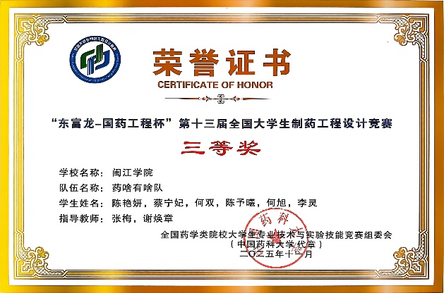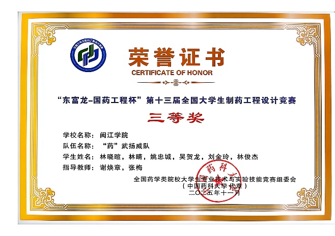 近日,“东富龙-国药工程杯”第十三届全国大学生制药工程设计竞赛圆满落幕。beat365材化学院学子凭借扎实的专业功底、出色的工程设计能力和默契的团队协作在竞赛中脱颖而出,由张梅、谢焕章两位老师指导,2022级制药工程专业陈艳妍、蔡宁妃、何双、陈予曦、何旭、李灵(2023级)组成的“‘药’啥有啥队”以及2023级制药工程专业林晓暄、林晴、姚忠城、吴贺龙、刘金玲、林俊杰组成的“‘药’武扬威队” 双双获大赛三等奖,展现了学院学子的专业风采。