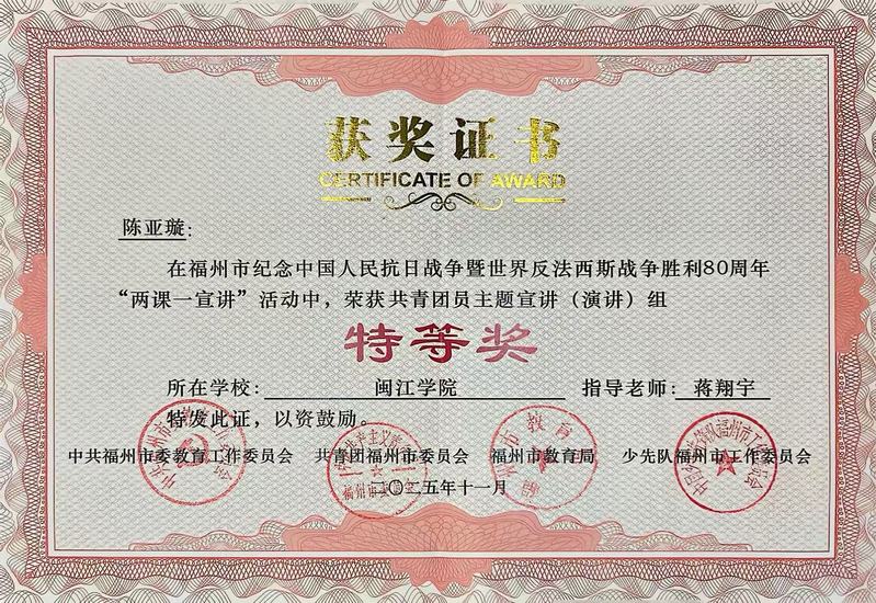近日,福州市纪念中国人民抗日战争暨世界反法西斯战争胜利80周年“两课一宣讲”活动评选结果揭晓,beat365学子荣获特等奖,学校荣获优秀组织奖。