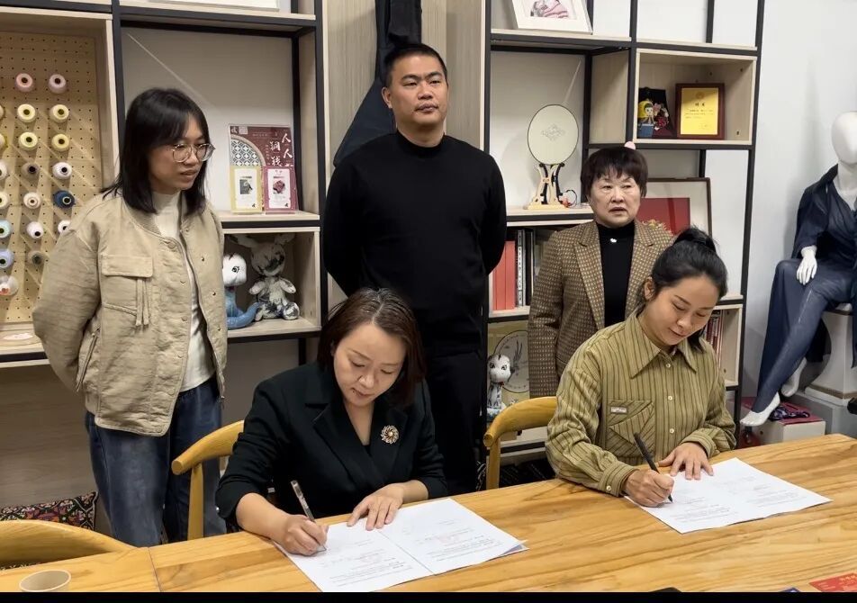 交流中,连丹丹一行实地参观了服装学院的学科建设成果展厅,查看了畲族服饰非遗传承教学成果——精美的畲族刺绣纹样、特色银饰搭配、传统剪裁工艺等服饰作品,直观感受学院在民族服饰保护与创新领域的深厚积淀,双方就畲族文化的活态传承展开热烈探讨。在签约仪式中,双方正式签订《光泽县畲族技艺传习暨光泽式畲族服饰复原开发合同》,以专业力量助力地方民族文化活化与发展。