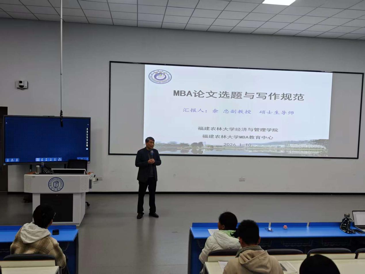 1月10日,新华都商学院研究生教育中心在本部教学楼2A108教室举办“MBA卓越讲坛——MBA论文选题与写作规范”专题讲座。活动面向2024级与2025级MBA研究生,共计170余名学生参加讲座。讲座邀请福建农林大学经济与管理学院专业学位教育中心副主任、案例中心主任余忠副教授主讲。