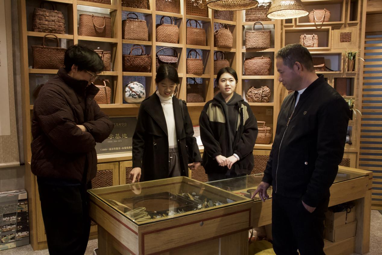 藤编非遗代表性传承人张庆明为实践队成员讲解 齐楚涵供图