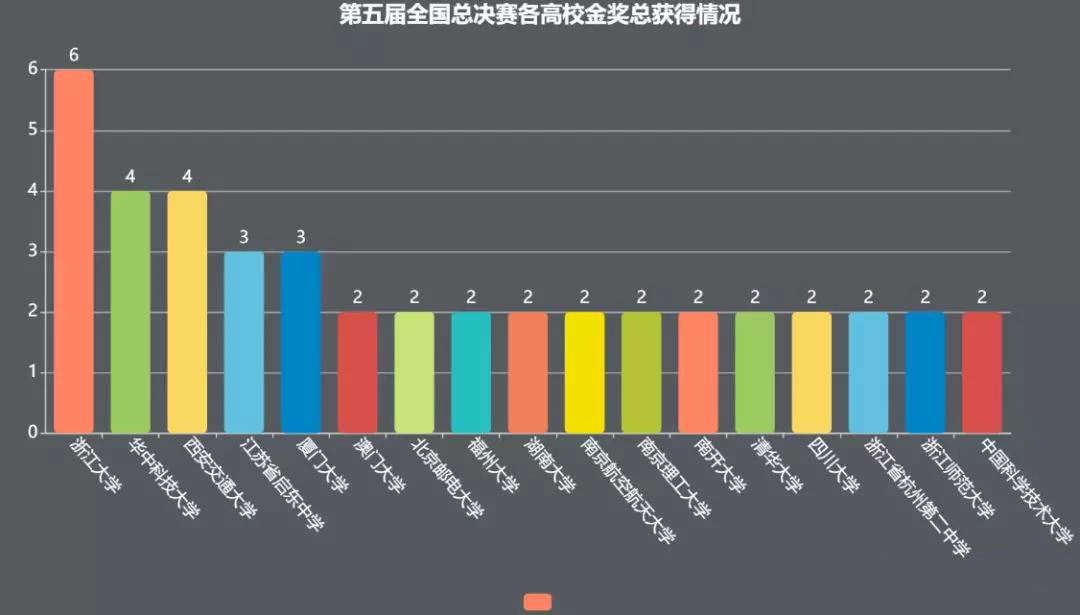 从图表6可以看出,今年金奖获得数的赢家无疑是浙江大学,浙江大学在所有赛道上共计获得6项金奖,位列全国高校榜单第一名,华中科技大学和西安交通大学在众高校中也突出重围,均获得4项金奖的好成绩,而福建省的厦门大学和福州大学今年也分别获得3项和2项金奖的佳绩。除图表上的高校,其余高校金奖获得数均未超过1项。