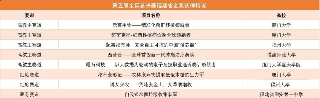 从图表7可以看出,福建省在今年的大赛上成绩突出,整体成绩在全国排在第3,除了在职教赛道上并无佳绩外,分别在高教主赛道、红旅赛道和萌芽赛道均获得金奖,其中,高教主赛道5项金奖,红旅赛道2项金奖,萌芽赛道1项金奖,而厦门大学成绩较为优异,共获得3项金奖的成绩。第五届中国“互联网+”大学生创新创业大赛圆满落幕,愿各位再接再厉,明年再获佳绩!