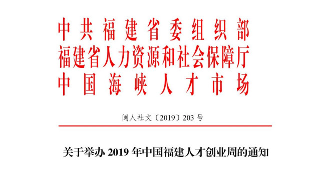为贯彻落实习近平总书记参加十三届全国人大二次会议福建代表团审议时的重要讲话精神,聚天下英才助推我省高质量发展落实赶超,省委组织部、省人社厅、中国海峡人才市场和福州市人民政府将于11月26日至29日联合举办2019年中国福建人才创业周(以下简称创业周)活动。现将有关事项通知如下:
