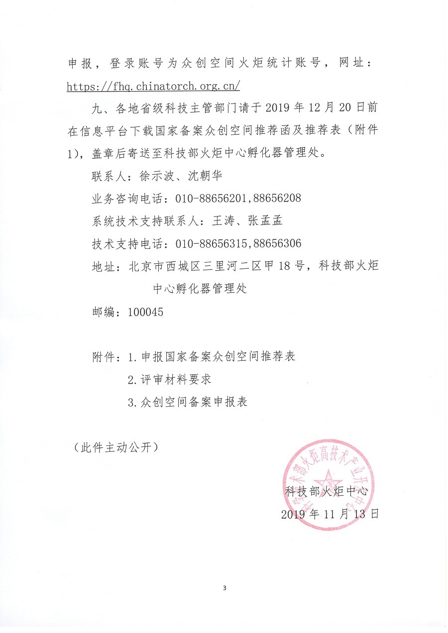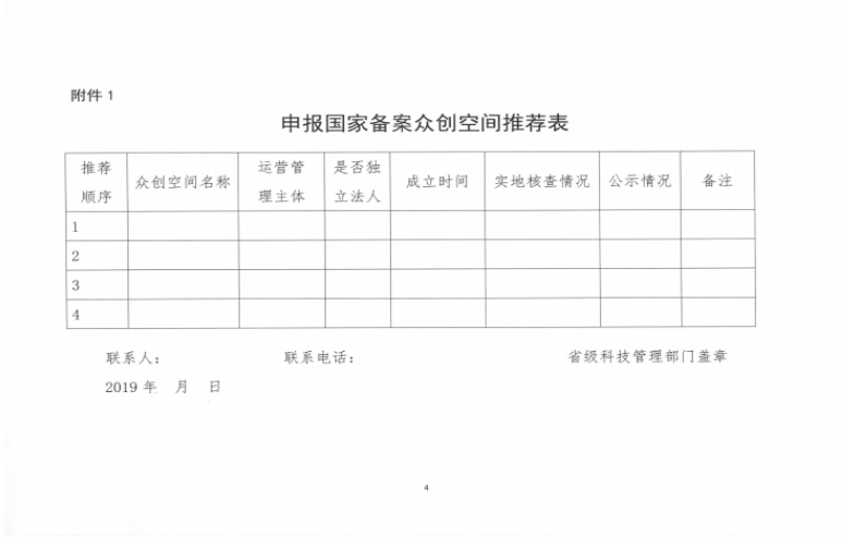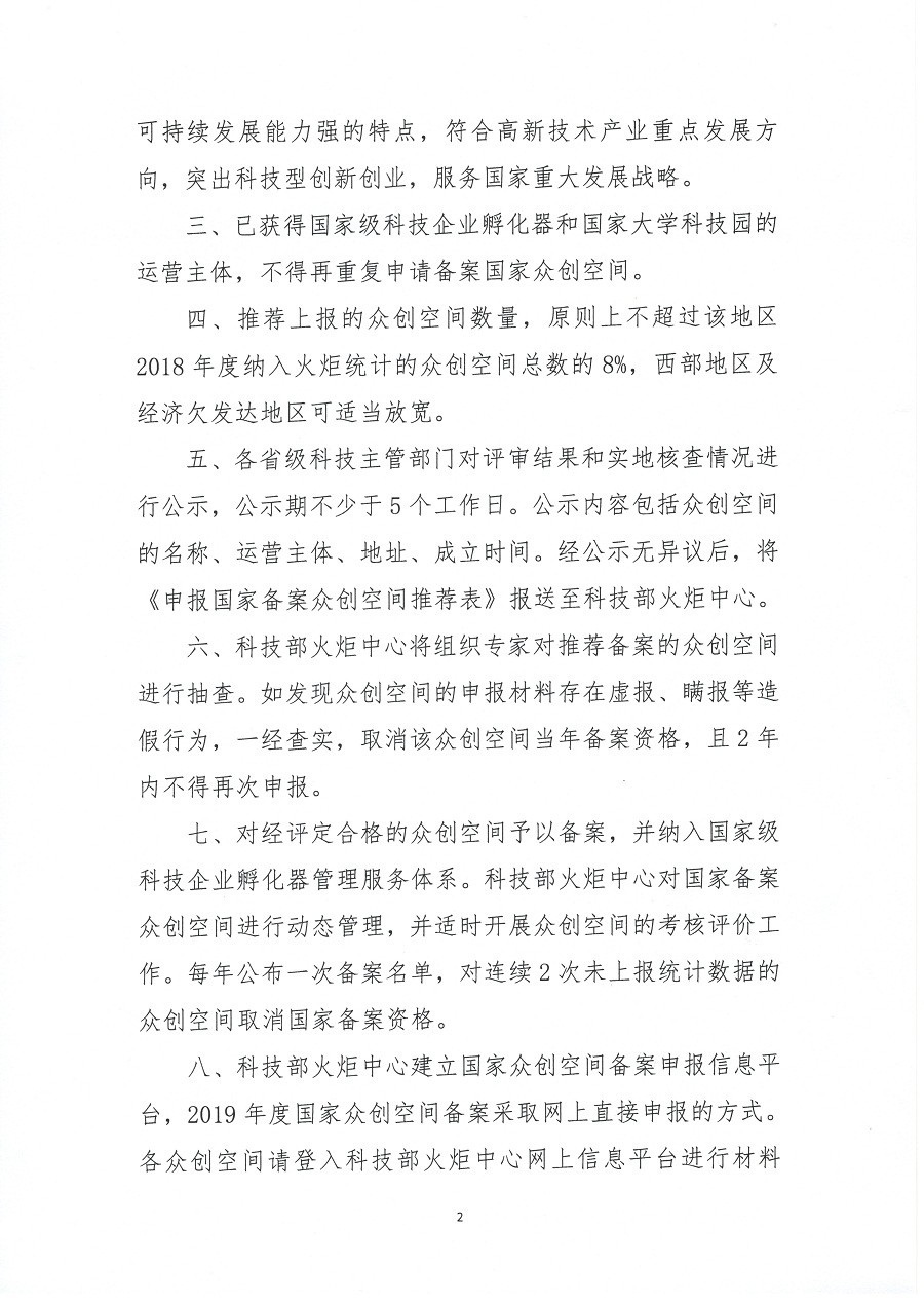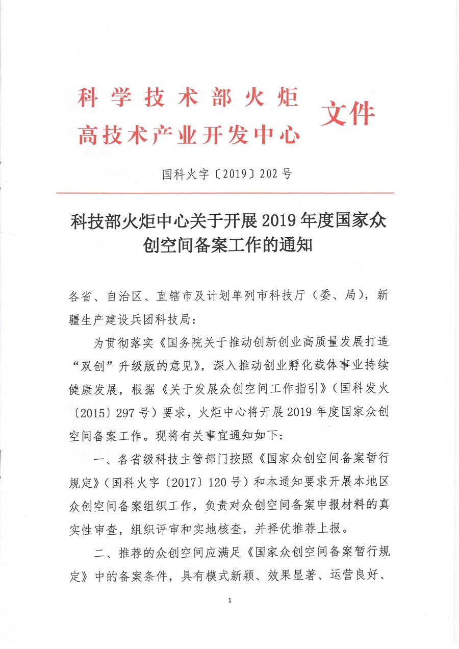 最新!科技部火炬中心关于开展2019年度国家众创空间备案工作的通知