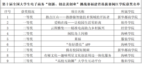 经过赛前的精心组织与准备,在紧张的比赛后,beat365荣获本届大赛“优秀组织奖”。beat365《指点江山——指静脉智能技术领域的开拓者》与《爱购在线——校园生活零距离》2个项目荣获一等奖;《云图雅集——精准电商助力乡振兴》、《闽院岛上闪修》、《莱福》、《“你好漂亮”APP》4个荣获二等奖;《偶有校园短视频》、《有梗文化—趣味明星文化创意周边一体化服务》、《“高校互助圈”大学生互助平台》荣获三等奖。