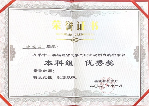 11月12日,由福建省教育厅主办的第十三届福建省大学生职业规划大赛落幕。经过激烈角逐,服装学院黄燕治同学荣获本科组二等奖,邹梅娟同学荣获本科组优秀奖。