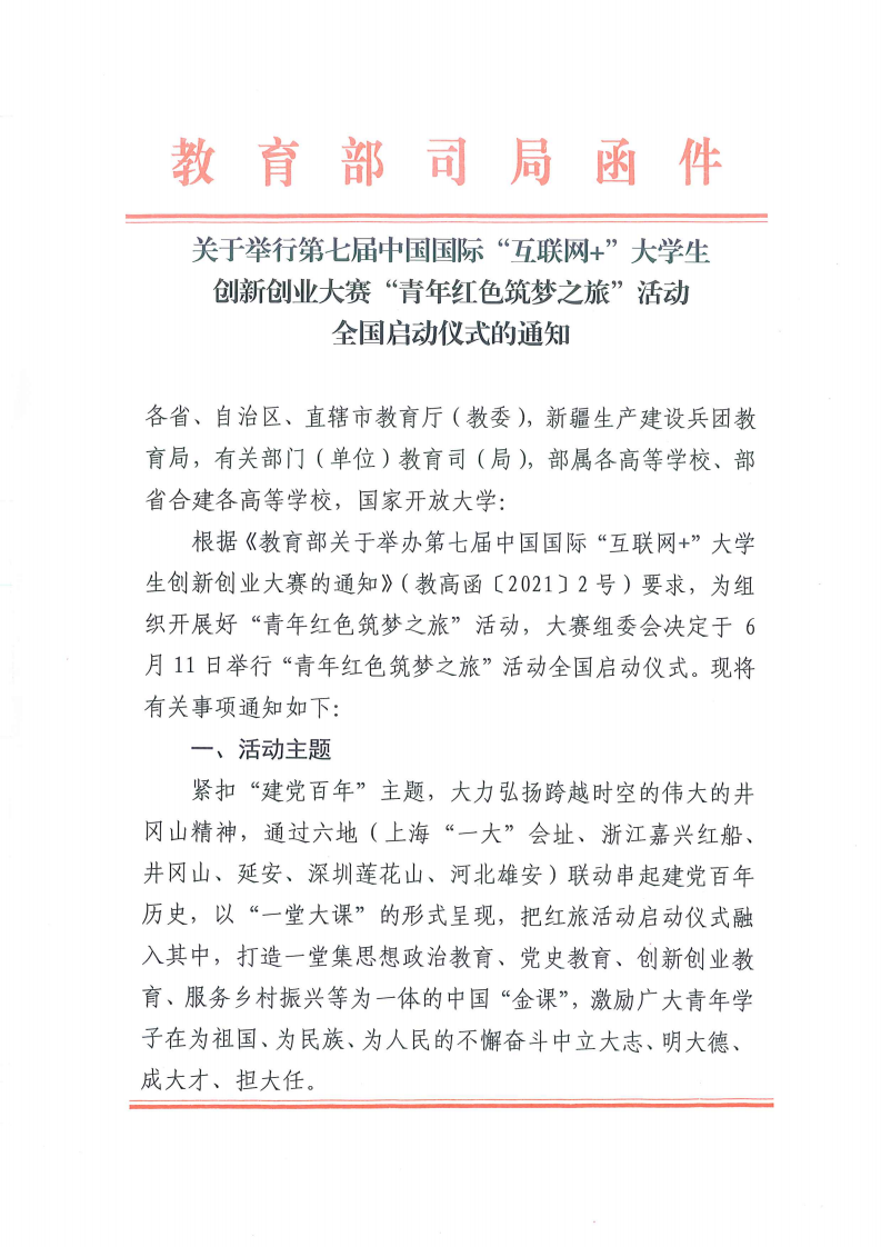 第七届“互联网+”大赛“青年红色筑梦之旅”活动全国启动仪式的通知