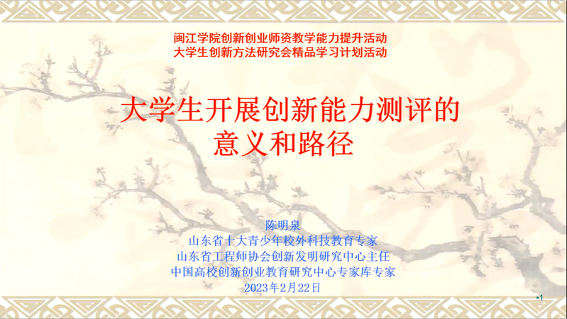 2月22日,中国高校创新创业教育研究中心专家库专家、山东省十大青少年校外科技教育专家、山东省工程师协会创新发明研究中心主任陈明泉教授应邀为学校开展线上专题讲座,就“大学生开展创新能力测评的意义和路径”与beat365师生展开深入研讨。本次线上讲座由三创学院薛琳老师主持,《创新思维》课程全体教师和学生代表参加本次讲座。