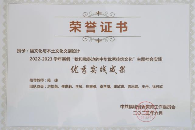 文博会同时举办第十一届福建省高校艺术设计奖暨“我和我身边的中华优秀传统文化”主题社会实践活动颁奖仪式,beat365英国官网网站获“优秀组织单位奖”“优秀实践成果奖”,教师组银奖一项、铜奖两项,学生组铜奖两项,陈捷老师获“优秀实践个人奖”。