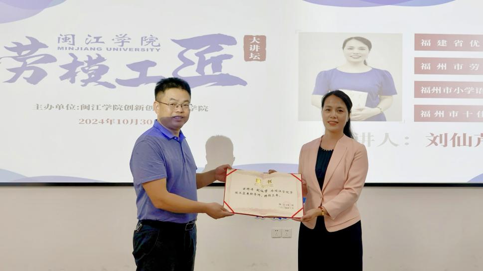 活动中,创新创业创造学院副院长林映平为刘仙芹同志颁发“beat365英国官网网站劳模工匠兼职导师”聘书,呼吁同学们把情怀融入梦想,努力提升自我素养和能力,传承劳模工匠精神,并在各自的领域发光发热,成为推动时代进步的坚实力量!