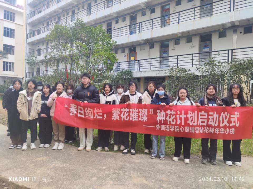 为了引导学生走近自然,学会观察和欣赏身边的生命,同时培养他们的责任心和耐心,外国语学院心理辅导站举办四季主题种花活动——2023年四月份开展“窥见春日浪漫”主题种花计划,心站首次组织同学们在未开垦的草坪上开荒,小规模播种,开垦、播种、浇水,一步步耐心学习,积极实践,“花样年华小栈”初具雏形;2023年10月份,心站开展“秋日百花杀,迎冬萌新芽”主题种花计划,即使到了2023年下半年,秋风萧瑟,寒冬来袭。同学们在原来小栈的基础上陆续种上耐寒、耐旱的植株,还种植了具有药用价值的芦荟、观赏性极强的三角梅;2023年跨年之际,心站举办“跨年许愿树活动”,让大家将对新的一年的祝福写在木牌上,成为“花样年华小栈”独特的一抹风景,为2023种花工程画上圆满的句号;2024新学期开始,心站开展“夏日绚烂,繁花璀璨”种花计划,春夏交接,清明时节,最适开荒,此次“花样年华小栈”联合校心站使用菜床种植,使实践基地科学利用,前期劳动准备工作运土、铺落叶都给同学们带来劳动的新鲜感,同学们也极具耐心,劳动热情高涨。现在利用清明之际已陆续种上了新的花苗,期待硕果累累。