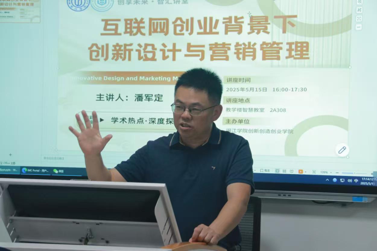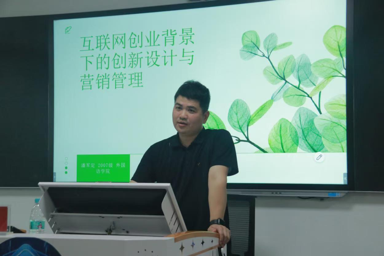 讲座伊始,潘军定学长以《互联网创业背景下文创设计与营销管理》为主题,结合自身创业之路展开分享。他首先回顾了大学学习经历对自己创业意识的启发,随后围绕互联网创业背景、创新设计策略、营销管理方法及国际贸易应用等板块进行专业分析。并通过泡泡玛特海外运营等典型案例,深入解析了行业趋势与实战经验。