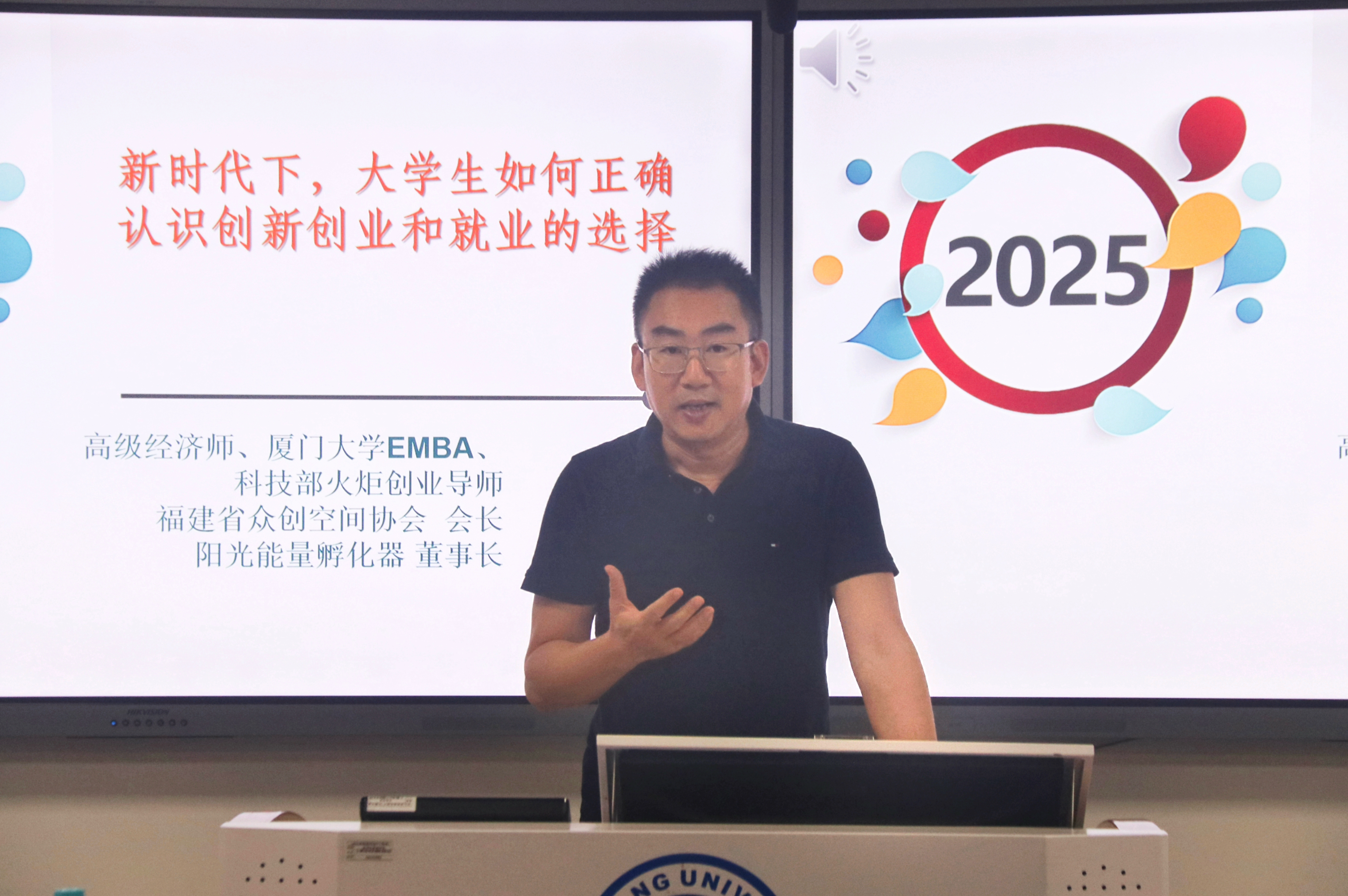 仪式最后,国家火炬创业导师、福建省众创空间协会会长陈秀斌围绕《新时代下大学生创新创业和就业的选择》作专题讲座。他结合国内外形势与就业数据,深入剖析当前就业环境的机遇与挑战,解读国家“十四五”“十五五”期间创新驱动发展战略的内涵,并鼓励学员善用高校与产业资源,理性选择创业路径,积极融入众创空间与孵化生态,在实践探索中不断成长。互动环节,陈秀斌悉心解答了学员们关于“胖东来超市”模式的发展趋势、大学生如何处理创业与学业协调发展等问题,整场活动节奏紧凑、内容充实,学员们反响热烈。