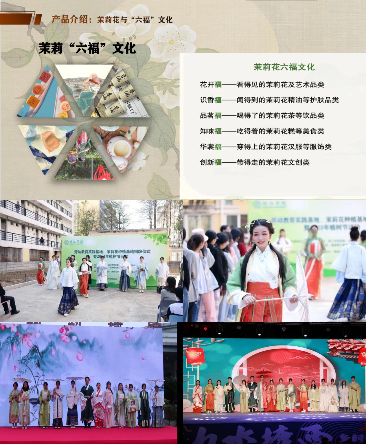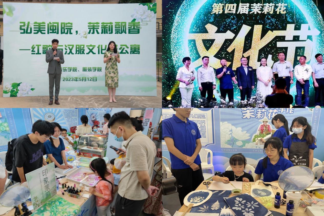 服装学院以弘扬劳动精神、劳模精神、工匠精神,帮助学生树立正确的劳动价值观为使命,聚焦福州茉莉花文化,坚持守正创新,构建“专业建设+创新创业+劳动教育+美育实践+文化传播”五位一体的文化传承创新和劳动教育育人体系,促进学生全面发展的同时积极赋能福州茉莉花文化创造性转化、创新性发展,为福州城市文化名片增光添彩。