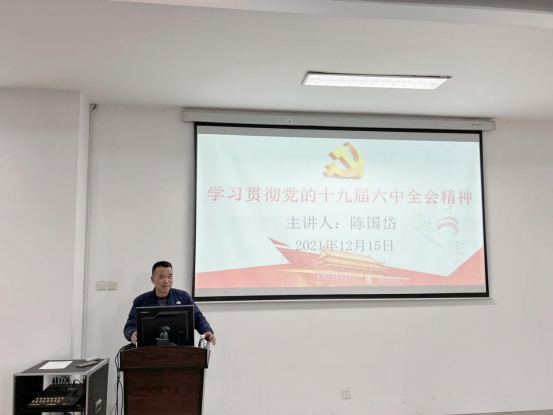 陈国岱书记以《学习贯彻党的十九届六中全会精神》为题,从深刻认识召开党的十九届六中全会作出新的历史决议的重大意义、深刻认识党的百年奋斗的初心使命和重大成就、深刻认识中国特色社会主义新时代的历史性成就和历史性变革、深刻认识党百年奋斗的历史意义和历史经验,走好新的赶考之路四个方面,对全会精神进行了系统宣讲和深入阐释。他强调,要深刻认识党的十九届六中全会的重大意义和深远影响,切实把思想和行动统一到全会精神上来,从党的百年奋斗重大成就和历史经验中汲取智慧力量,更加坚定地捍卫“两个确立”,更加自觉地增强“四个意识”、坚定“四个自信”、做到“两个维护”,以史为鉴、开创未来,埋头苦干、勇毅前行,一步一个脚印把习近平总书记“后发先至”的殷切期望变为美好现实。