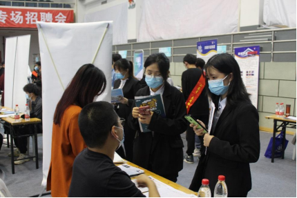 招聘会现场气氛热烈,人潮涌动,用人单位在“小蓝星”志愿服务队的志愿者的引导下依序坐落,“小蓝星”们用礼貌亲和展示着地海学子的良好精神风貌。展位前,求职毕业生络绎不绝,他们身着正装,手持简历,与用人单位积极交流沟通。
