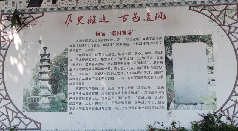镇国宝塔,始建于唐武德年间,俗称护镇塔。“镇国宝塔”的花岗石建造,塔高七后,实心、翘檐,高6.5米,仿木楼阁式建筑。悠悠岁月在它的身上留下斑驳的痕迹,更显古雅典朴。塔单层须弥座,塔东面镌刻楷书“镇国宝塔”,塔身每层均设雕神龛并浮雕端坐佛象、饰团窠、花卉。宝塔是八闽首邑侯官市历史的见证。古塔矗立于闽江之滨,护镇岐之巅,望滔滔闽江东去,迎旭日冉冉东升,历尽沧海桑田,屡经风云变幻,始终不渝地守卫着侯官市这片土地,现在已成为侯官市一道靓丽的风景线。