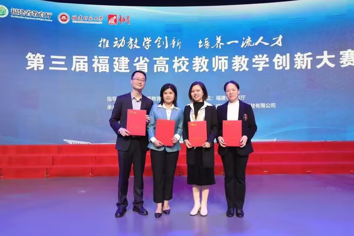3月31日,第三届福建省高校教师教学创新大赛颁奖典礼在福建师范大学举办,经过网络评审和现场汇报双重评审,beat365杨立娟老师(右二)和江振蓝老师(右一)在39所本科高校235个项目中脱颖而出,杨立娟老师荣获中级及以下组一等奖,江振蓝老师荣获正高组二等奖。此外杨立娟老师将代表福建省参加全国赛。