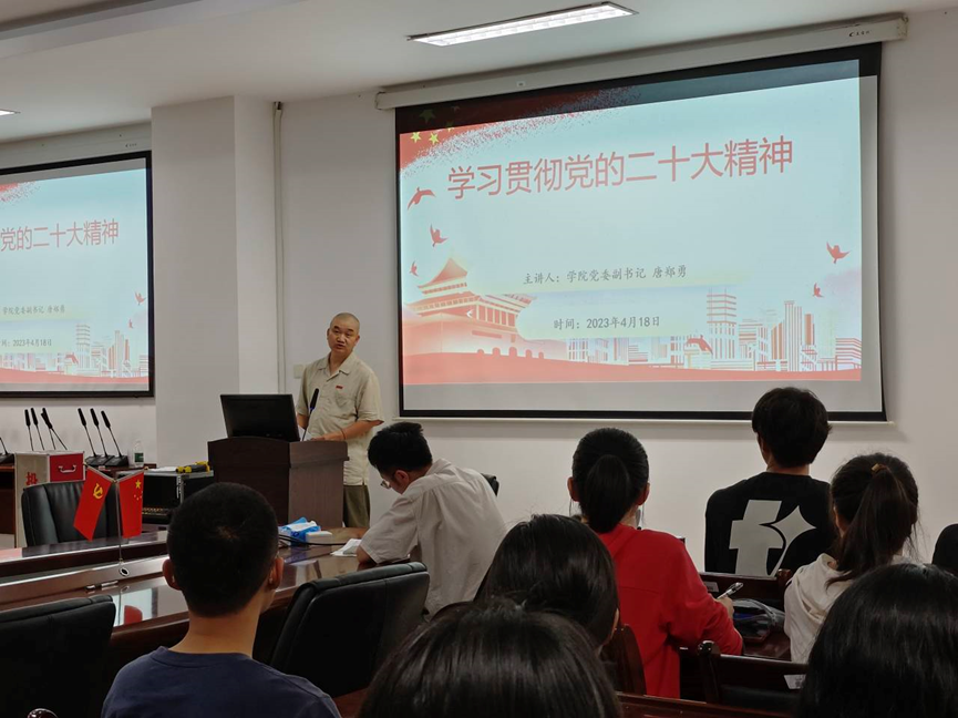 418日晚,培训班第一讲由学院党委副书记唐郑勇授课,唐郑勇副书记以《学习贯彻党的二十大精神》为题,分为四个模块进行讲述,强调了习近平总书记来校考察的精神以及学校确立了“一三四五五六”发展战略体系,勉励同学们抓住学院发展机遇,积极向上、努力发展自身。