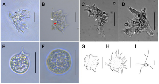 裸变形虫是一类形状可变的单细胞真核生物,可促进营养物质的再生循环,对细菌和藻类种群也起到一定的控制调节作用。马里亚纳马氏虫长30-120 µm,宽11-60 µm,前部透明质区域狭窄,有4—15个锥形亚伪足(兼具运动和摄食的功能)。细胞质膜外部的细胞被分为两层,厚度为190-290nm。目前相关成果已于近期在国际原生生物期刊Protist发表。