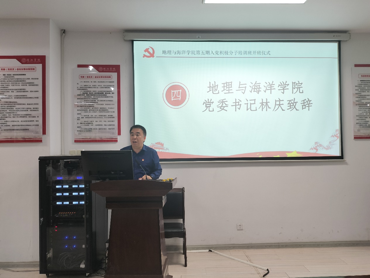 为加强入党积极分子培养教育,2023年11月8日,地理与海洋学院党委于广成楼306会议室举行第五期入党积极分子培训班开班仪式,学院党委书记林庆、副书记唐郑勇、团委书记刘帅、各年级辅导员及第五期党积班全体学员参会,此次会议由2021级辅导员陈越灵主持。