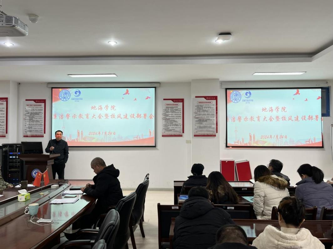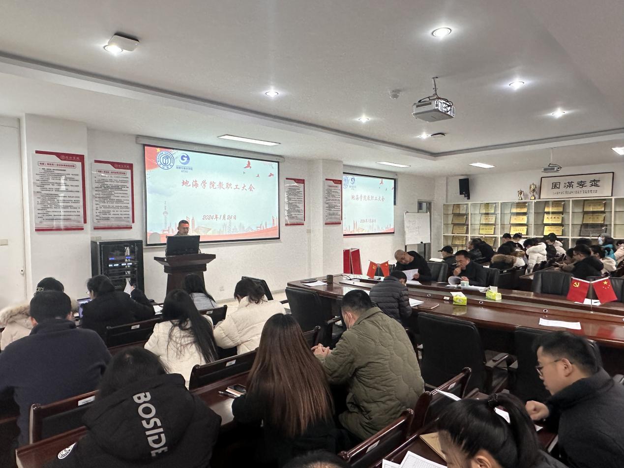 1月24日下午,地理与海洋学院在广成楼306会议室召开期末教职工大会暨校风建设部署会。学院全体院领导和教职工参加会议,会议由地海学院党委副书记唐郑勇主持。