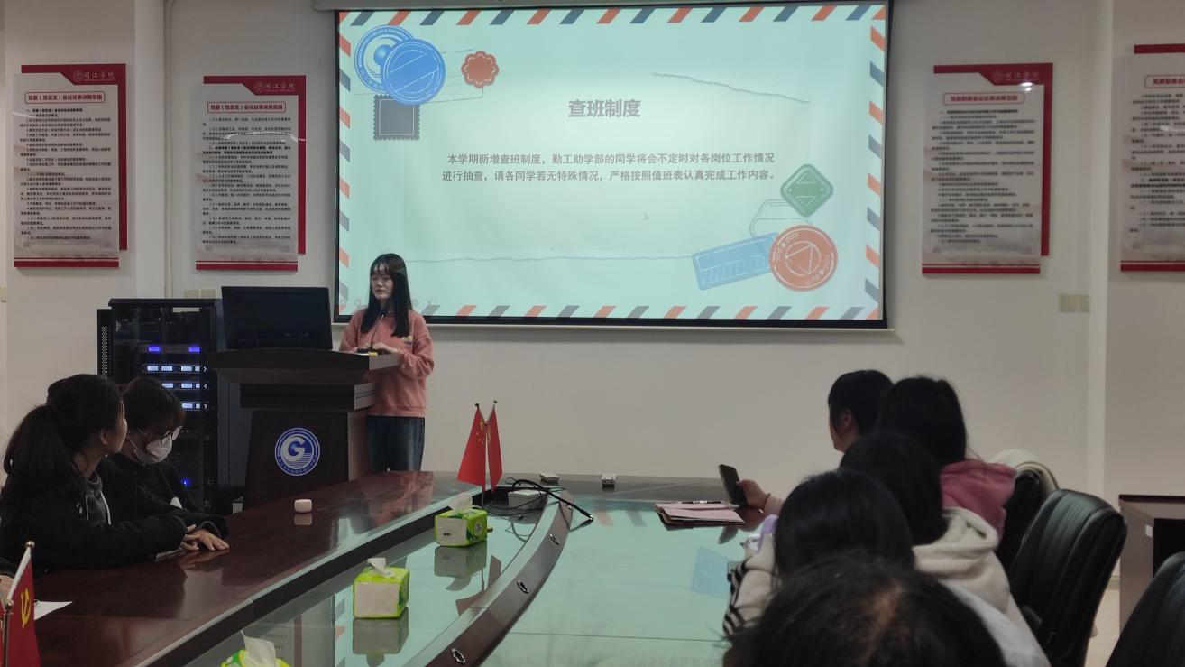 随后,学院资助工作负责老师潘苑对勤工岗位的工作内容及要求进行补充讲话。潘苑老师对勤工岗位学生提出在岗位工作中要“勤思、勤学、勤问”,养成“事事有回响,件件有回音”的工作态度与方法,按时到岗、文明有礼、认真负责、积极主动等工作要求。对勤工助学的意义进行深刻剖析,希望勤工岗位学生们能合理规划时间,珍惜工作锻炼的机会,学会感恩,自觉遵守岗位规章制度,认真做好岗位工作,在工作实践中成长。