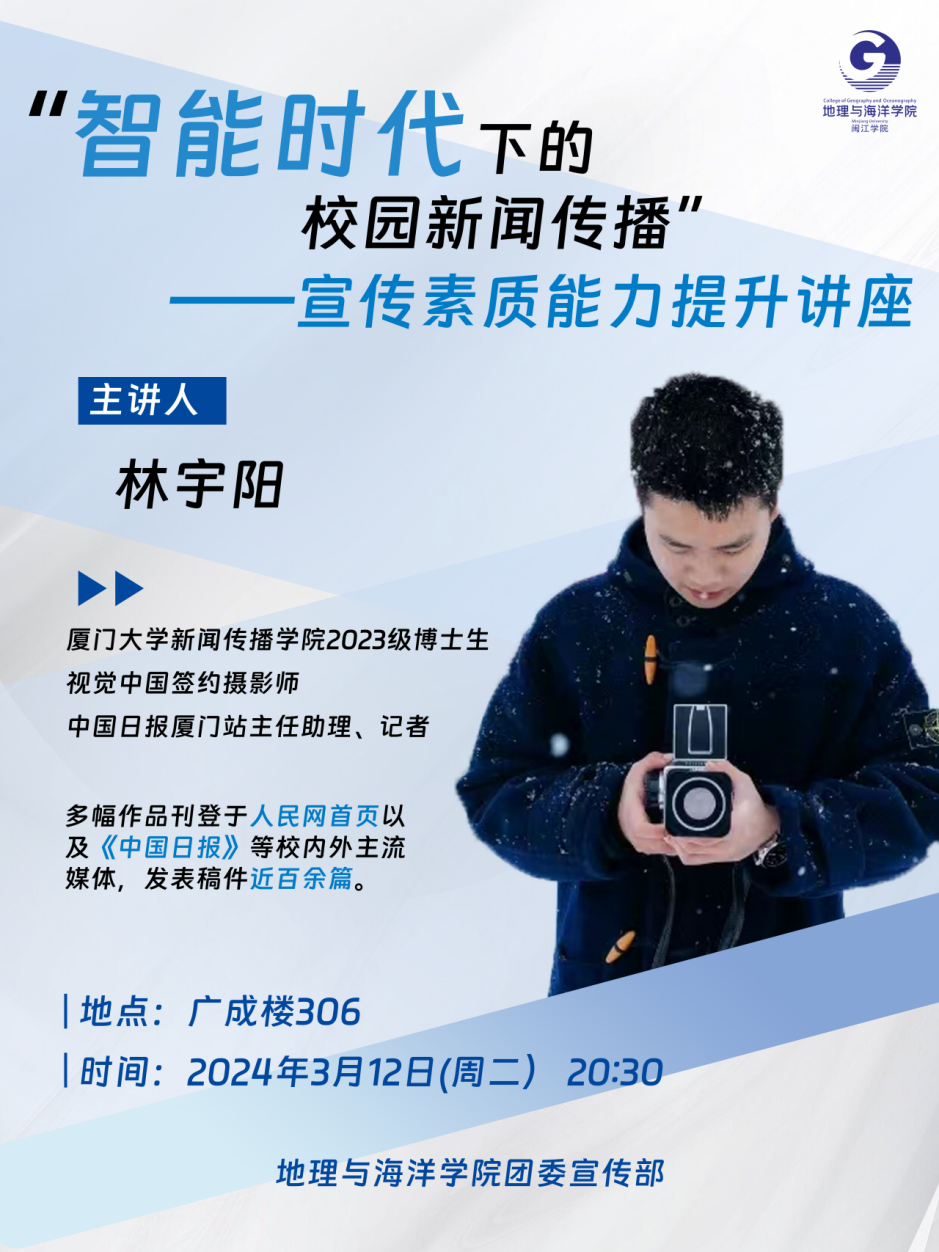 为帮助学生了解并掌握新时代下的新闻传播技巧和策略,提升学生综合素质能力,2024年3月12日晚,地理与海洋学院团委于广成楼B306开展“智能时代下的校园新闻传播”宣传素质能力提升讲座。本次讲座荣邀厦门大学新闻传播学院2023级博士生、视觉中国签约摄影师、中国日报厦门站主任助理、记者林宇阳主讲,讲座由地理与海洋学院团委宣传部指导老师潘苑老师主持。