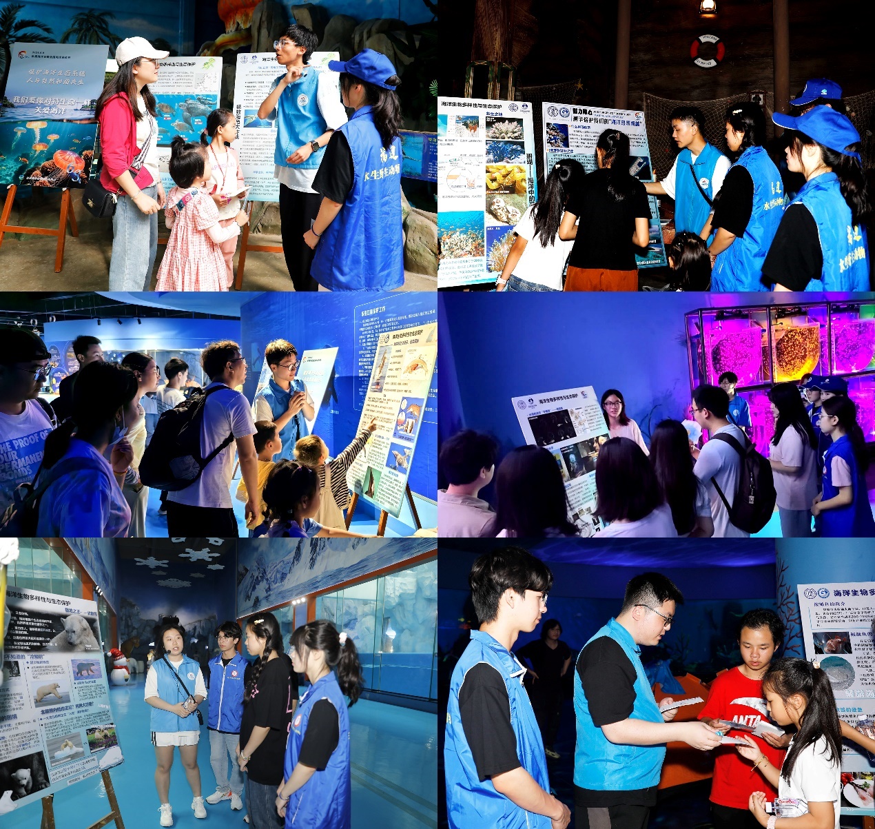 68日,beat365英国官网网站地理与海洋学院“小蓝星”志愿服务队、2022级海洋资源与环境专业全体同学们赴福州欧乐堡开展科普活动。他们精心准备了一系列主题科普海报,内容涉及了海龟、鲸豚、珊瑚、水母、鱼类、北极熊等海洋生物,以丰富的画面、有趣的知识、生动的语言向公众展示了海洋生物的多样性与生态特性,呼吁大家行动起来,共同保护蔚蓝的海洋。在海龟岛,林万涛等同学以“什么决定了海龟宝宝性别”这一问题为切入点,解释了影响海龟性别的环境因素。在水母宫,鲁子豪和林镜雨同学介绍了水母独特的生活史和秘密武器。在珊瑚馆,覃亮卓等同学介绍了珊瑚礁的形成、生态作用和面临的威胁,强调了保护珊瑚礁生态系统的紧迫性和重要性。在圆梦海底,倪其琛等同学展示了鮟鱇鱼独特的生存策——如何利用背鳍上的“小灯泡”在深海中捕食,让游客对深海生物的环境适应性有了具象化的理解;同时,王成佳等同学展示了隆头鱼的多样性与性逆转特性。在鲨鱼湾,王健苏等同学为游客们介绍“家宅子”黑鳍鲨与“夜猫子”白鳍鲨。在鲸豚馆,陈海滨等同学为游客们介绍海洋中的社交能手——糙齿海豚,郭嘉宝等同学则介绍鲸的分类与习性。在极地馆,游可欣等同学介绍了北极熊的毛发特征和生存环境,揭示了全球气候变暖对北极熊种群的负面影响,唤起人们对极地生态环境保护的意识。