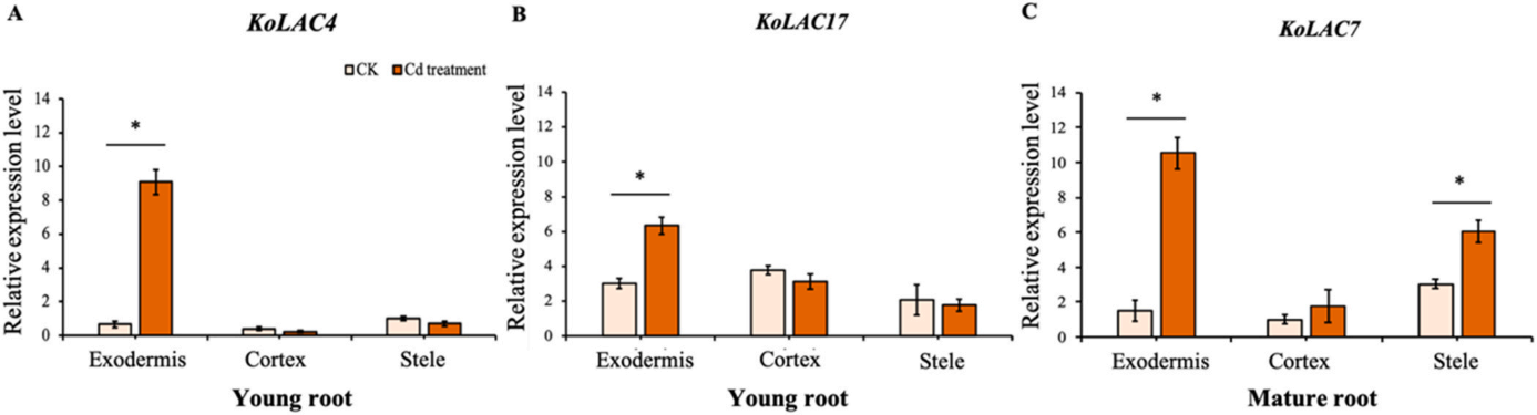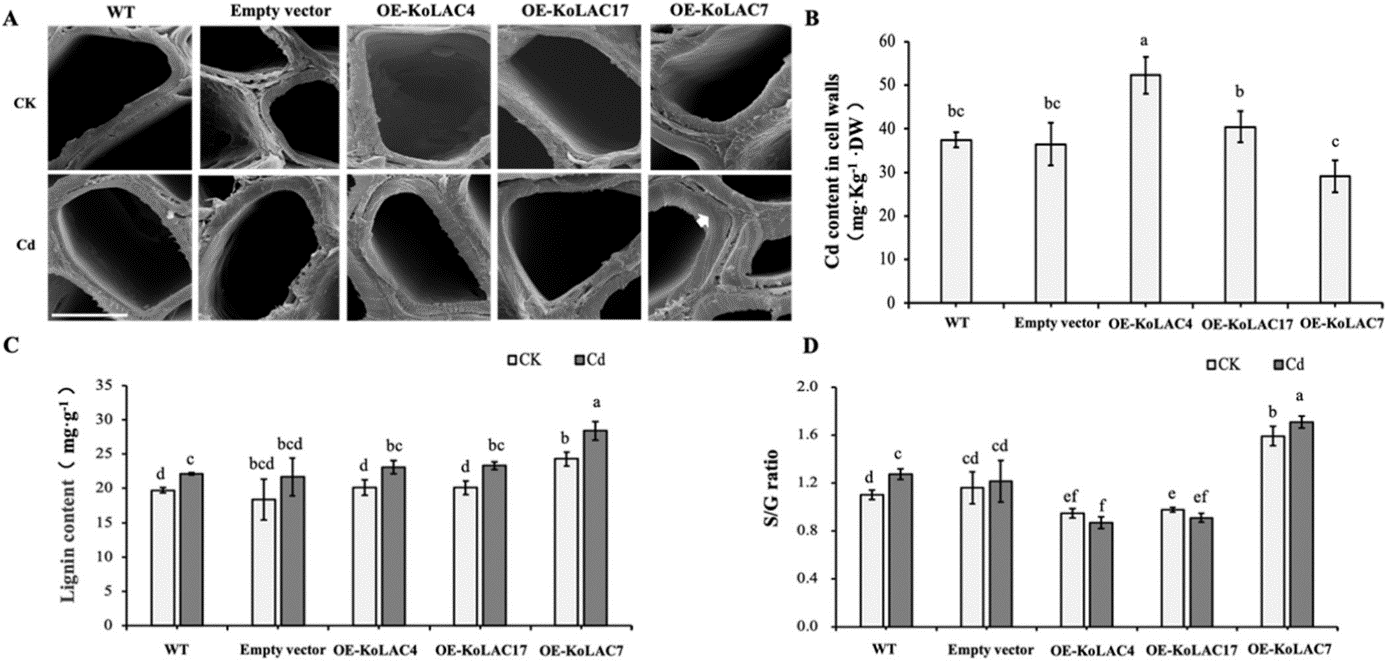 作者通过外源转化本氏烟草,初步证实过表达KoLAC4和KoLAC17可以显著增加木质素G单体的含量,而过表达KoLAC7可促进S型木质素单体的增加,且这个增加趋势在镉处理后更显著(图6)。