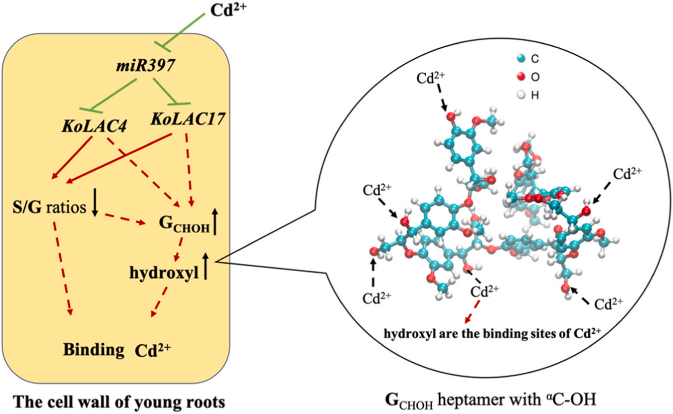 作者推测,在幼根的外皮层中细胞壁镉结合能力的增加与G木质素含量的增加相对应。换句话说,G木质素含量的增加提高了木质素聚合过程中的镉结合官能团(如羟基)占比,提高了细胞壁的镉结合能力(图7)。而成熟根的外皮中S木质素含量较高,同时镉胁迫加速了木质素的增厚,有效延缓了根对镉的吸收,但S单体的积累与木质素增厚之间的联系尚不清楚。