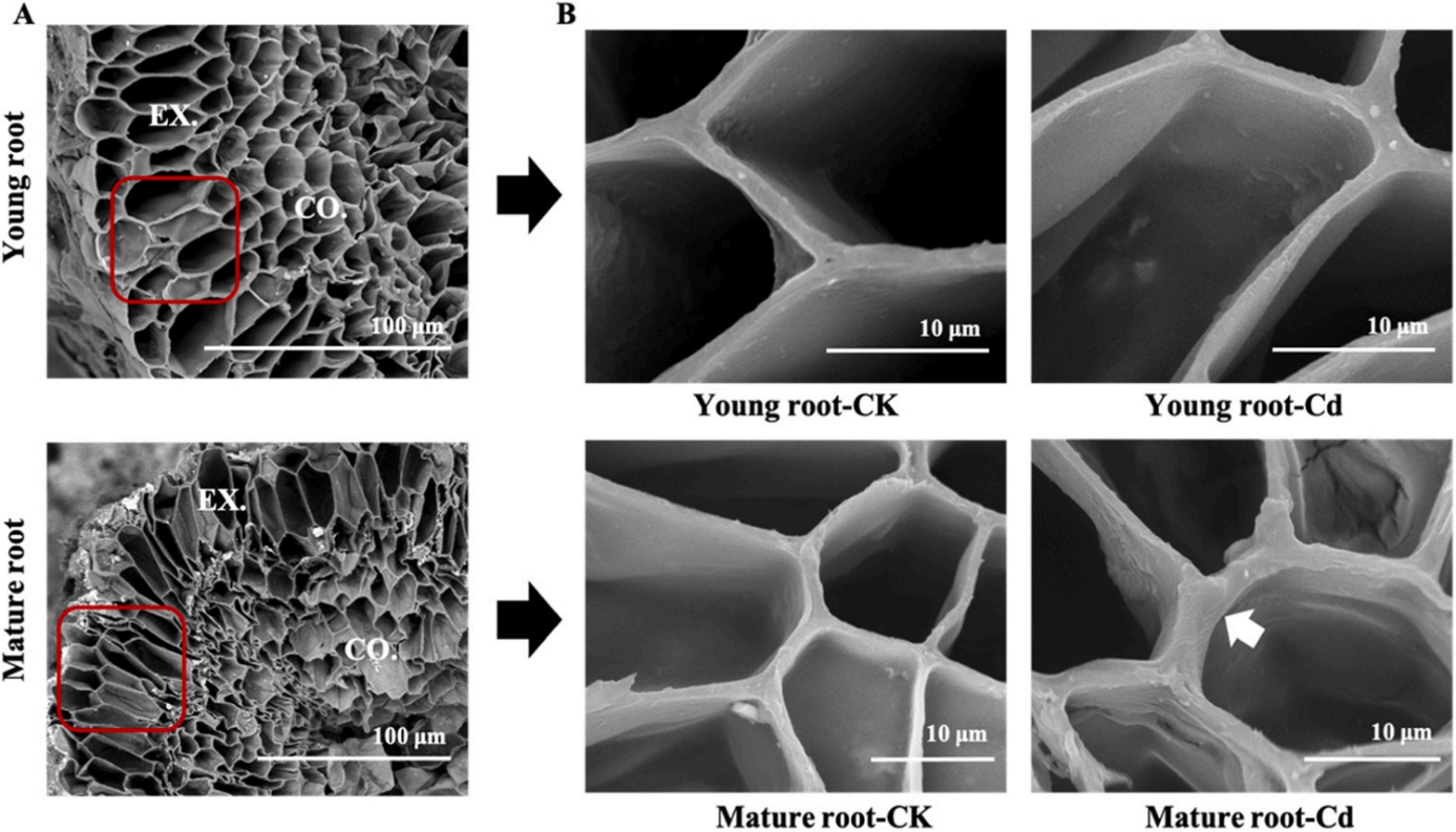 (A)利用Phenom 扫描电子显微镜(SEM-EDX,Phenom ProX)选取K. obovata的幼根和成熟根(直径5-10毫米,距根尖4-8厘米),并通过能量色散X 射线光谱进行观察。红色框内区域表示幼根和成熟根外皮细胞排列的形态差异。(EX:外皮层;CO:皮层)(B)白色箭头表示镉胁迫后根外胚层细胞壁增厚,木质素在细胞壁中积累。