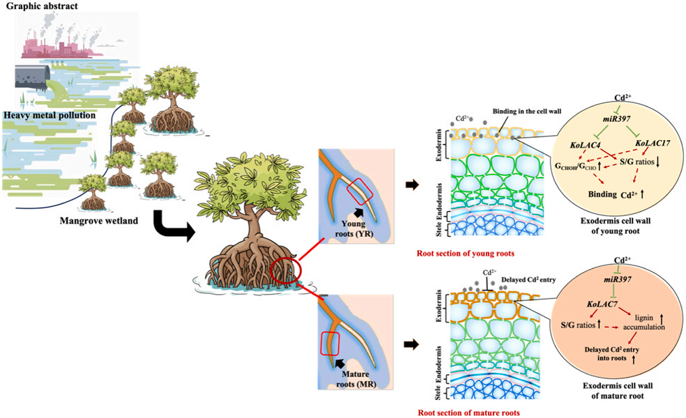 红树植物秋茄(Kandelia obovata)根外皮的次生木质化对其应对高盐度和厌氧环境等逆境至关重要,这种木质化还能有效阻止镉向根部的迁移。然而,不同发育阶段根外皮木质化对镉胁迫的响应差异及其调控机制尚未揭示。该研究利用扫描电镜和能量色散X 射线光谱分析了根的结构和细胞壁厚度,并测定了根细胞壁中的镉含量,发现幼根和成熟根的外皮层通过不同木质素单体的聚合对镉胁迫做出不同响应:形成束缚和阻档两种机制。通过小RNA测序、RLM-5’-RACE和双荧光素酶瞬时表达系统,明确了miR397对KoLAC4/17/7的靶向调控。KoLAC4/17的表达促进了木质化过程中愈创木酚的积累,增强了镉与细胞壁的结合。同时,KoLAC7的表达促进了木质化过程中丁香基木质素的积累,增强了对镉的阻碍作用,提高了对镉的耐受性。