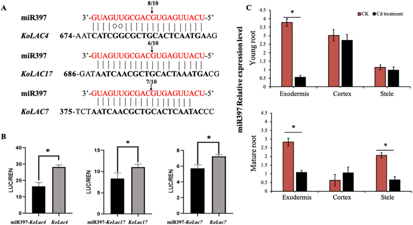 (A)利用RLM-5'-RACE 确定靶标位点。图中显示了目标mRNA序列和成熟miRNA序列。垂直箭头表示5'-RACE确定的miRNA介导的裂解产物的5'端,并显示克隆的频率。(B)双荧光素酶瞬时表达系统也用于检测miRNA与靶基因之间的调控。(C)镉胁迫下miR397在秋茄幼根和成熟根不同组织中的表达量测定。星号表示数值差异显著(P<0.05)。