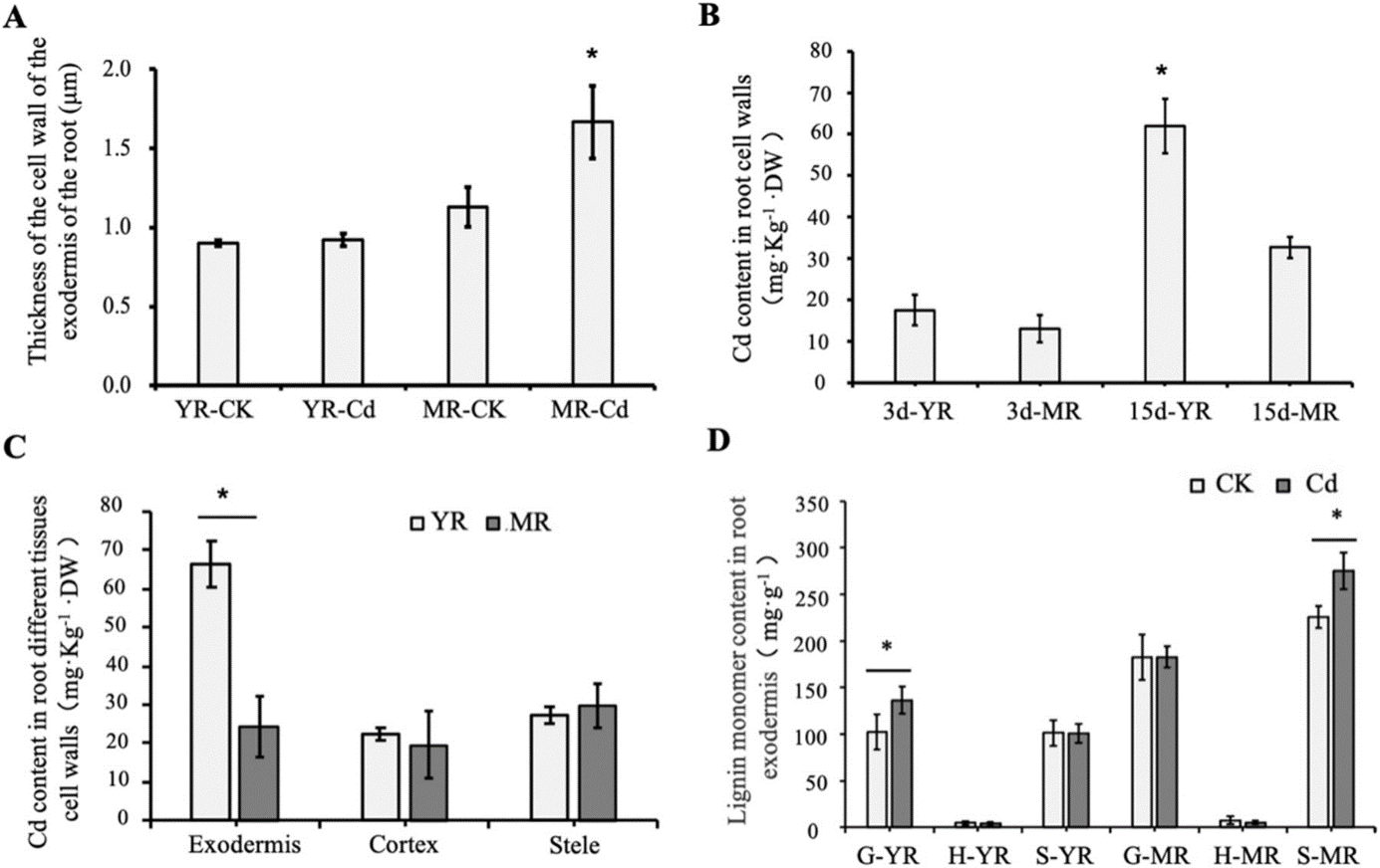 该研究利用扫描电镜和能量色散X 射线光谱观察到成熟根的外皮细胞比幼根的外皮细胞排列更紧密(图1)。此外,在长期(15天)的镉胁迫下,成熟根的外皮细胞壁可见木质素积累(图1),细胞壁在镉胁迫下明显增厚(图2A)。此外,作者发现在长期镉胁迫下,幼根外皮细胞壁的镉含量是成熟根的两倍(图2B)。进一步测定幼根和成熟根不同组织的细胞壁镉含量后发现,幼根外皮层细胞壁的镉结合能力高于其他组织,说明在长期镉胁迫下,幼根对镉的束缚作用强于成熟根(图2C)。另外,对根外皮层木质素单体组成的分析表明,在镉胁迫下幼根外皮中愈创木基(G)的含量显著增加。同时,在成熟根中,镉胁迫后丁香基(S)的含量明显增加(图2D)。