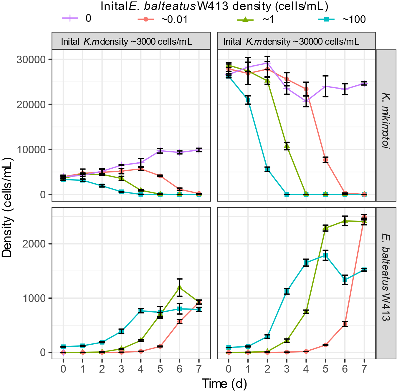 图2 不同初始密度的波罗的游仆虫对于不同发展阶段的米氏凯伦藻模拟赤潮的防控效果。